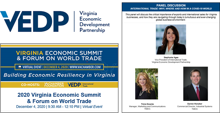 Virginia Economic Development Partnership (VEDP), the state government economic development agency, selected TMEIC Corporation as one of 12 companies accepted into its two-year Virginia Leaders in Export Trade (VALET) program. The VALET program assists companies in the Commonwealth of Virginia committed to international trade as a growth strategy. The program provides participating companies with export planning services, market research, and assistance from a team of experienced global service providers to help meet the companies' international business goals.